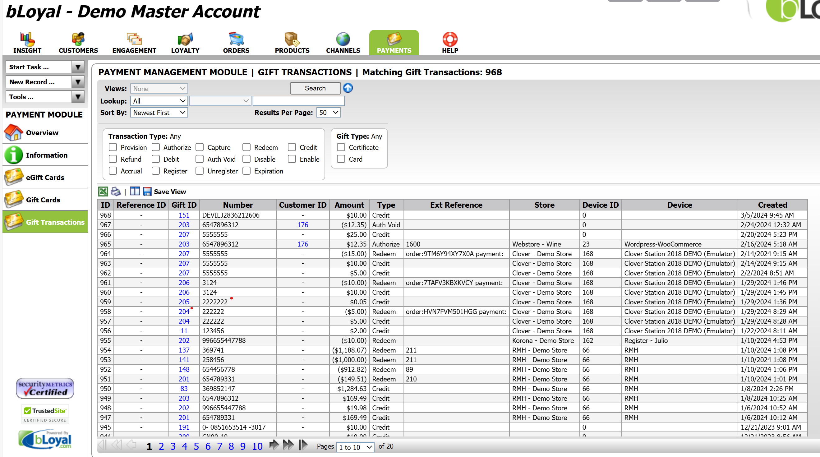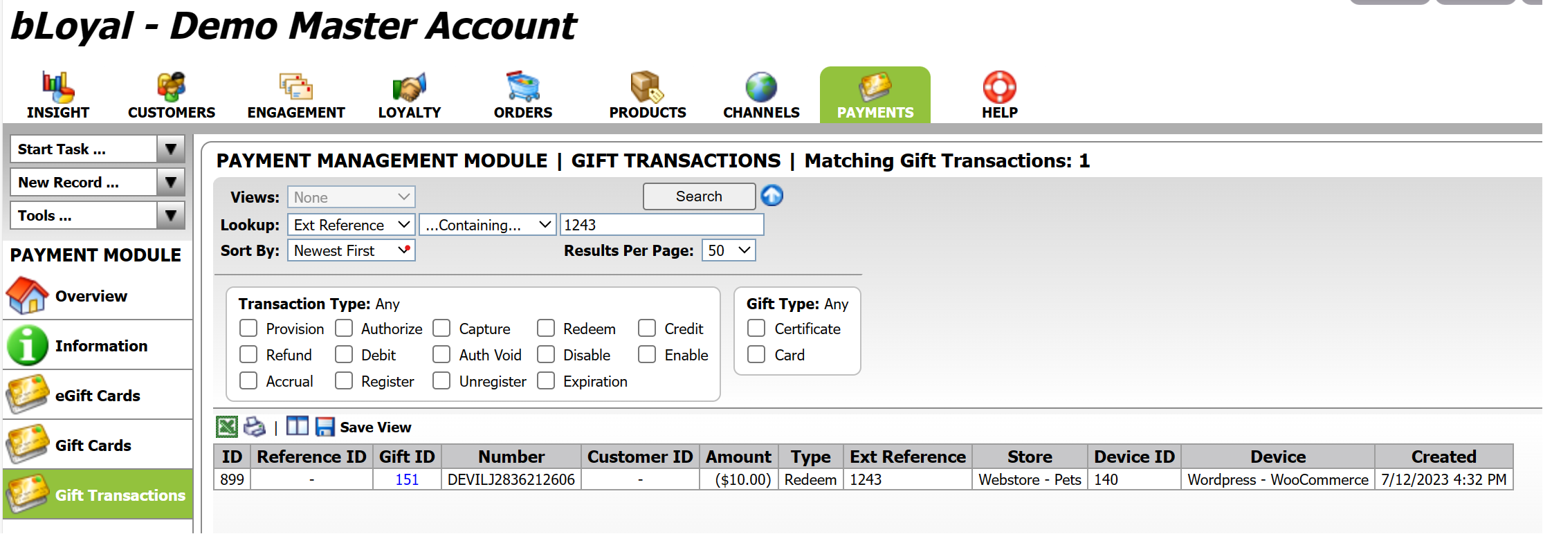 3) Set the Lookup for Ext Reference, this will be the Order # from the external system. Please note that not all integrated systems populate the Ext Reference, in which case you will want to get the Gift Card number from the customer and search for the Gift Card directly.
