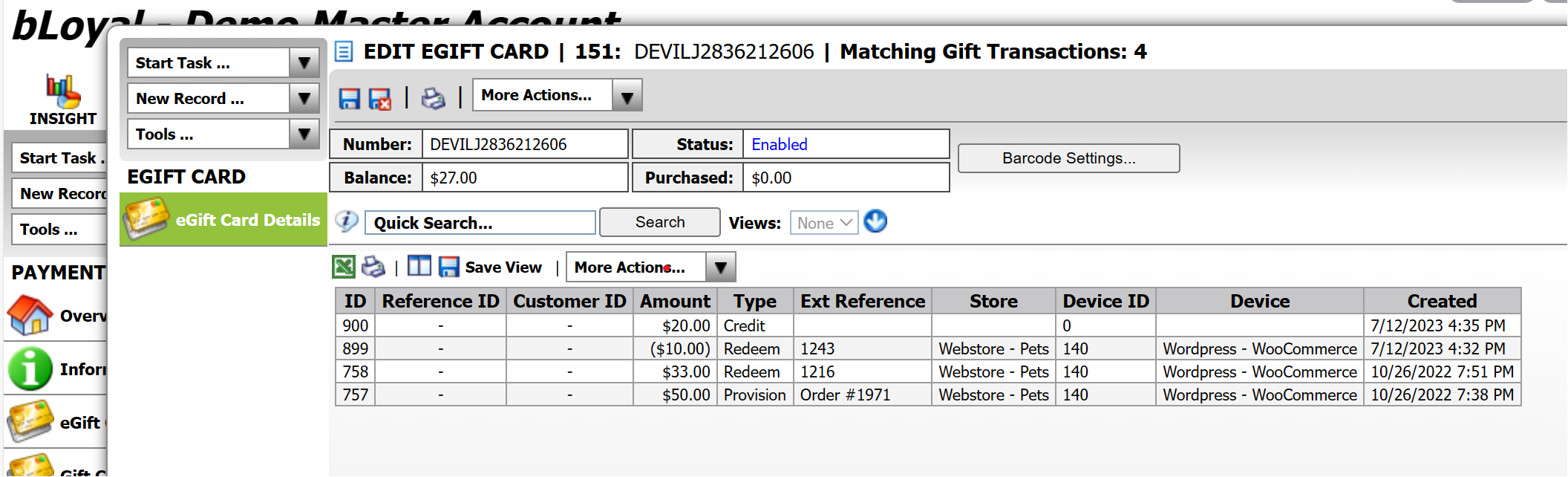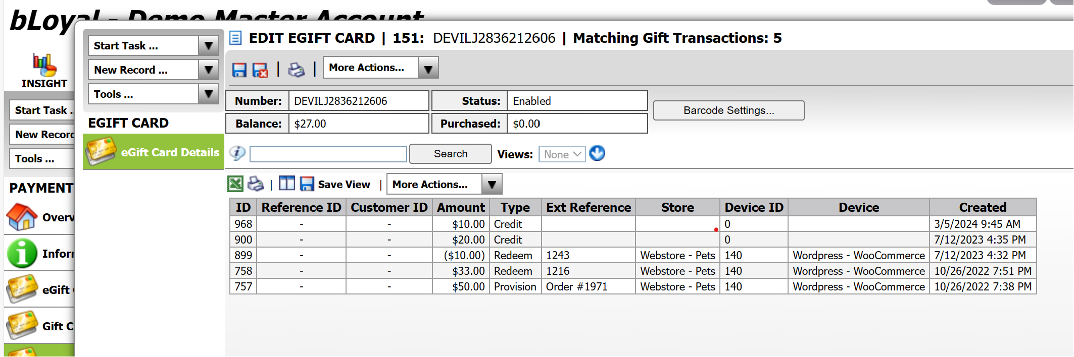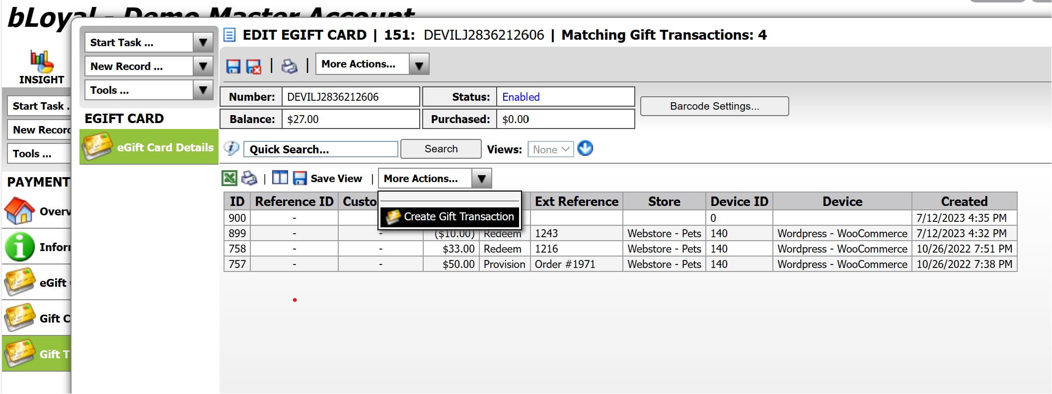 13) The new Credit transaction will be displayed, and the Gift Card balance will be adjusted accordingly.