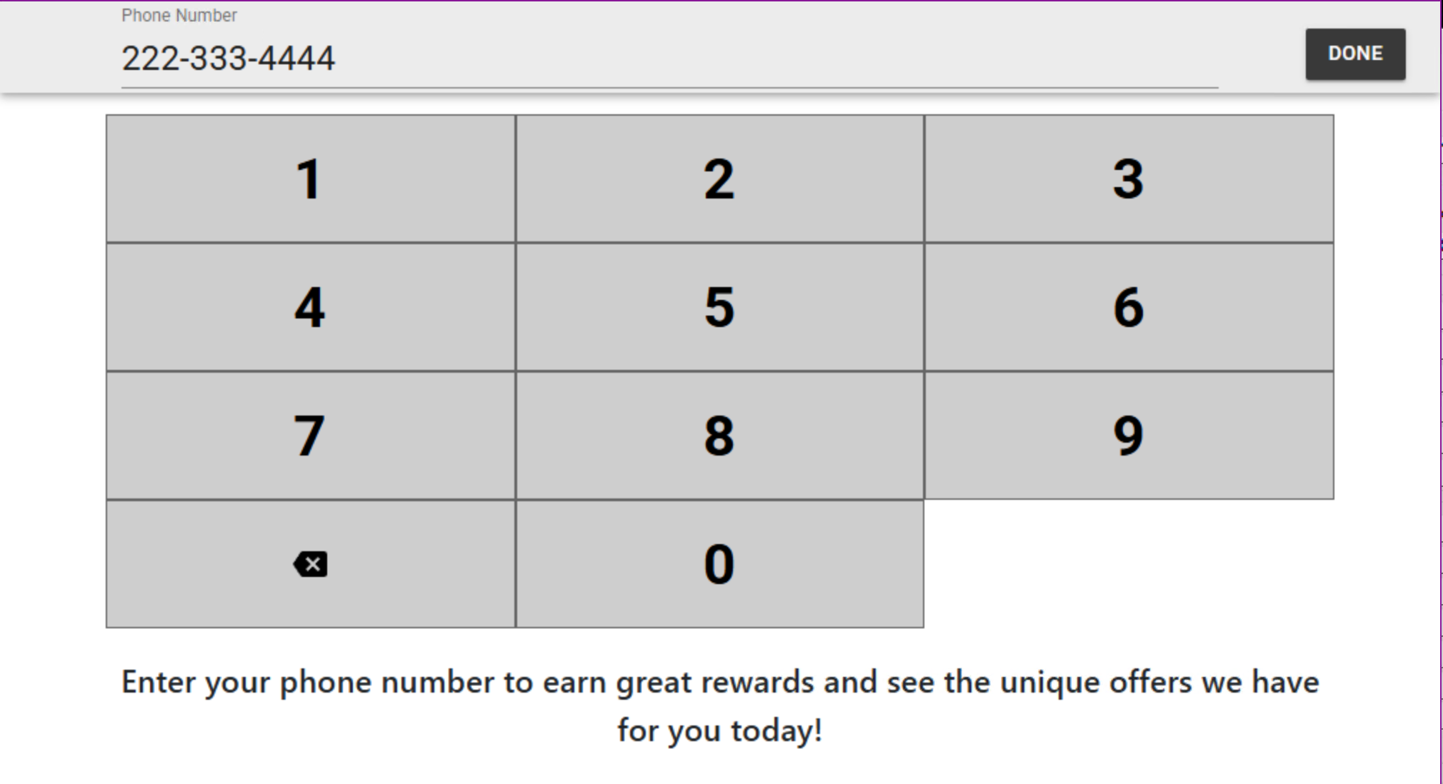 The Customer-Facing Snippet allows customers to key in their cell phone numbers to either look up or create their accounts, depending on whether they're already in the system. At any time during the start of a transaction (prior to going to the Total screen), they may tap in their cell number. The cashier will then see their account on the receipt when proceeding to the Total screen.
